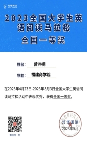 在为期10天(4月23日8点—5月3日8点)的2023全国大学生英语阅读马拉松活动中,bat365官网学生积极参与,认真阅读答题,取得非常优异的成绩。其中,2020级商务英语专业曾洲桐同学获全国一等奖且排名第一,同样来自2020级商务英语专业的张婕和张雅龙同学获全国二等奖,来自2022级商务英语专业的程俊炜同学获全国三等奖。