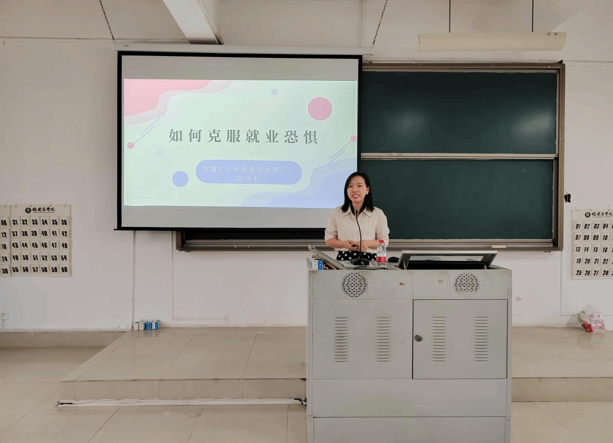 6月7日下午,安徽文香科技股份有限公司福建区陈丽杭总监为商务英语专业学生作题为“如何克服就业恐惧”的讲座。陈总监从个人成长经历出发,与专业学生分享了如何做好学习规划和学好专业技能、如何做好职业规划和职业选择、如何克服就业恐惧等。