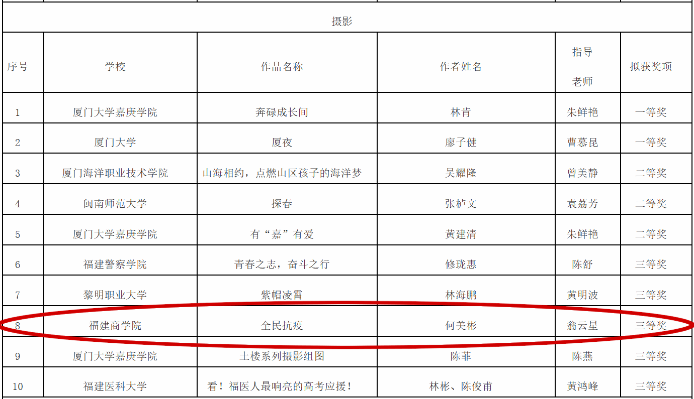 近日,由福建省委教育工委、福建省委网信办联合举办的第六届全省大学生网络文化节获奖名单揭晓。其中,bat365官网学子何美彬的作品《全民抗疫》(指导教师:翁云星)在此次比赛中荣获摄影类作品三等奖。