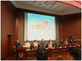 范云霞老师宣读外语系2018届毕业生情况和优秀毕业生名单。主席台上的老师们为毕业生代表、优秀毕业生分别颁发毕业证书、荣誉证书并合影留念。