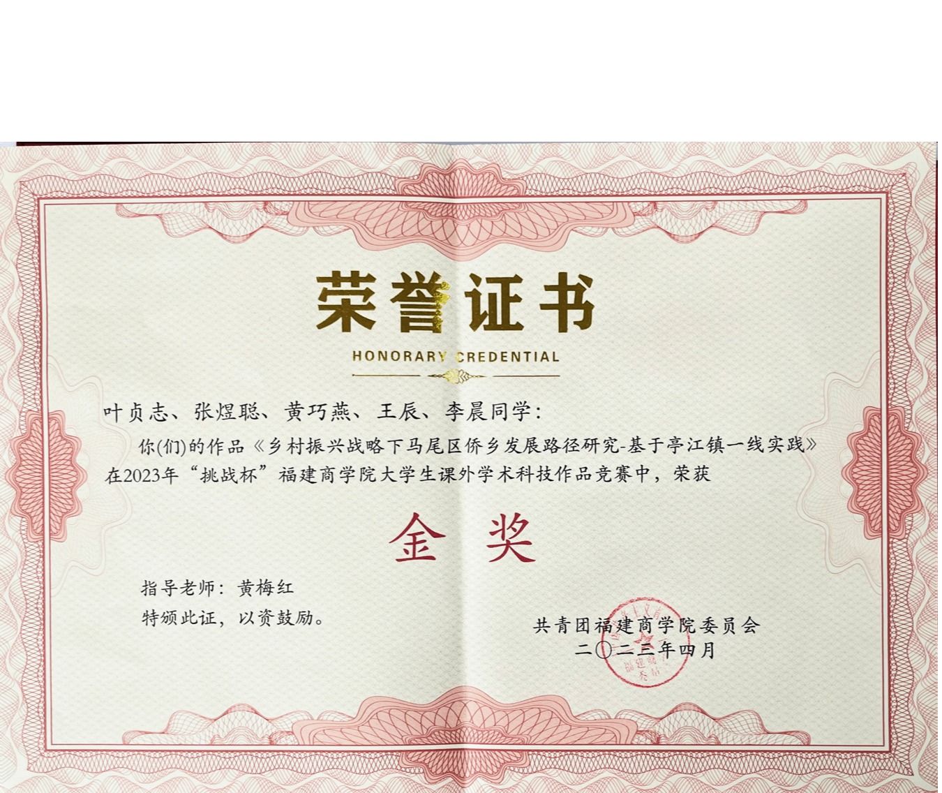 近日,由共青团bat365正版唯一官网委员会主办的2023年“挑战杯”bat365正版唯一官网大学生课外学术科技作品竞赛在连江校区明德楼落下帷幕。bat365官网21级日语3班叶贞志、21级日语2班张煜聪、20级日语2班黄巧燕、20级日语1班王辰、20级商务英语2班李晨五位同学的作品《乡村振兴战略下马尾区侨乡发展路径研究-基于亭江镇一线实践》(指导老师:黄梅红),在此次竞赛中荣获金奖。