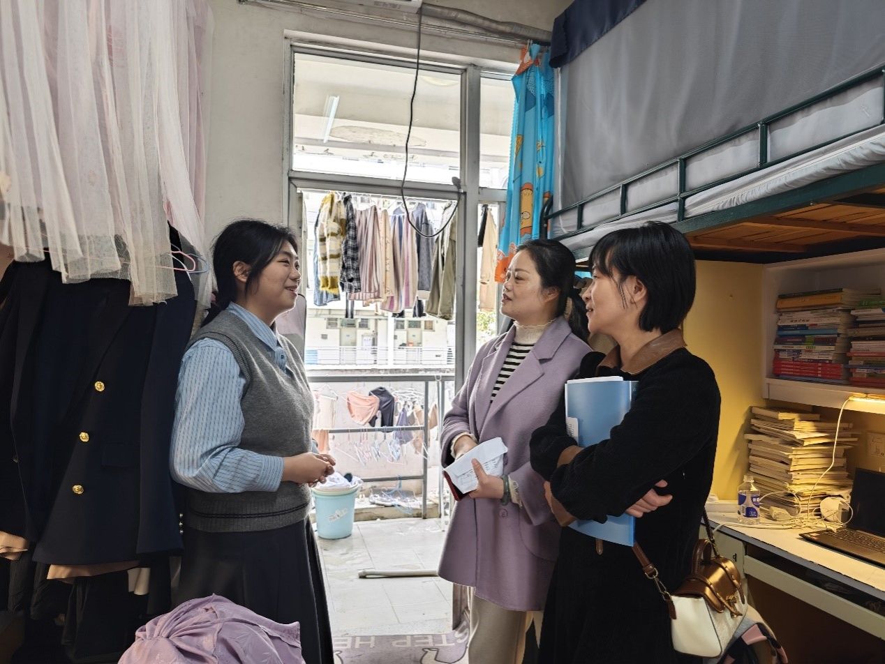 2024年3月27日,bat365官网党委副书记杨爱娥带领辅导员、自律会学生干部走进学生宿舍,进行实地走访调研,深入了解同学们的生活环境和学习状态,给同学们送去关怀和问候。