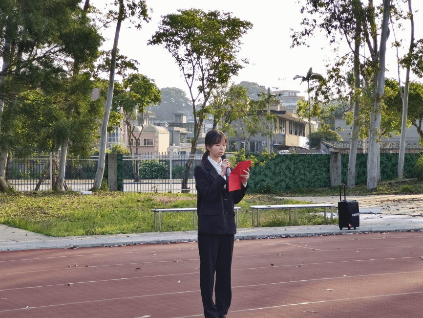 英姿飒爽的国旗护卫队迈着铿锵的步伐护送国旗入场。在庄严的国歌声中,鲜艳的五星红旗冉冉升起,全体师生肃立行注目礼,表达对祖国的崇高敬意。学生代表颜幸灵在国旗下发言。自2014 年起,“全民阅读”连续12年被写入政府工作报告,从最初的“倡导全民阅读”发展到“深化全民阅读活动”,全民阅读事业蓬勃发展。她倡议同学们立足于专业,深耕阅读,将学习的知识转化为务实的行动,将汲取的知识力量转化为青年力量,努力成为可堪大任的栋梁之材。学院团委书记翁云星在讲话中表示,读书可以让人保持思想活力,让人得到智慧启发,让人滋养浩然之气。同学们要形成强烈的自主阅读意识,把阅读当作“加油站”,在学懂弄通做实中不断坚定信仰,为讲好新时代的中国故事贡献青春力量。